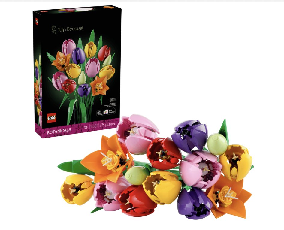 Add a gorgeous piece of flower decor to your home with the LEGO® Botanicals Tulip Bouquet (11501) building kit for adults. Capturing the joy and optimism of spring, this LEGO bouquet features 5 varieties of tulips in various colors and stages of bloom. Immerse yourself in the beauty of flowers as you craft vibrant green buds, purple closed tulips and red, yellow and pink opened tulips, plus green leaves for added authenticity. The flower building set also includes adjustable stems that make it easy to arrange the tulips into a bespoke LEGO bouquet. Once you’ve completed this fun craft project, the set becomes a stunning piece of floral home decor that will bring color to any space. A thoughtful gift for women and men on birthdays, Valentine’s Day, Mother’s Day, housewarmings or any other special occasions, this flower building set is available in the LEGO Builder app, where budding florists can access digital building instructions and track their progress. Set contains 576 pieces.
