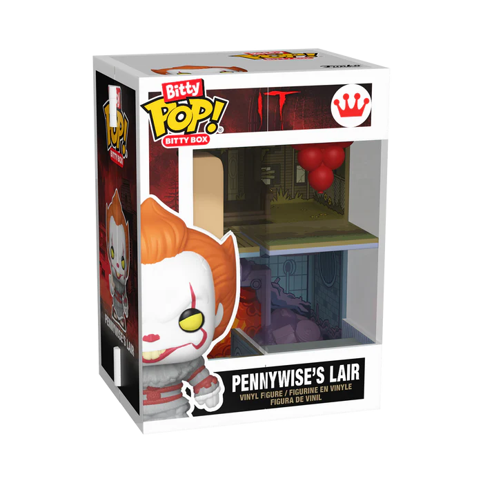 The world of POP! is getting bigger—and smaller—with Bitty POP! collectibles! Expand your IT collection with the Bitty POP! Bitty Box Pennywise’s Lair! This hard acrylic display case is modeled to resemble a POP! box and opens to reveal iconic rooms from around Pennywise’s Lair. This collectible also includes Bitty POP! Pennywise and Bitty POP! Georgie Denbrough! Mix and match with more of your favorite Bitty POP! figures with this Bitty Box collectible! Bitty POP! figures are packaged in hard acrylic display cases with detachable bottom lids.