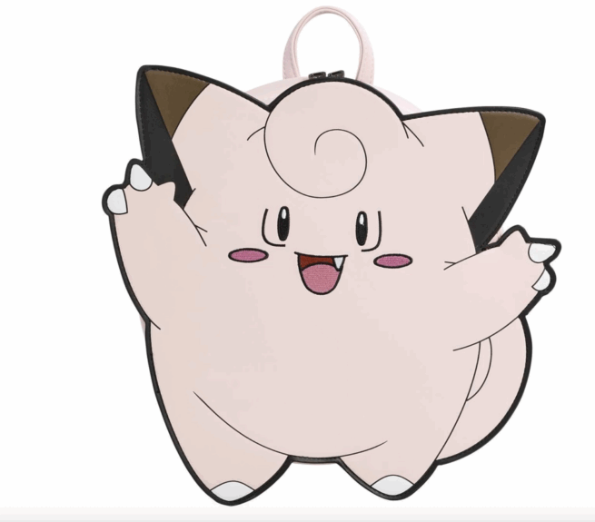 Add some fairylike whimsey to your outfit, and show off your love for Clefairy with this mini backpack by Loungefly! The shape of the bag matches the Fairy Pokémon’s adorable pink, round body, and if you want to gather together with friends and dance, the dual zip closure will keep your belongings secure.