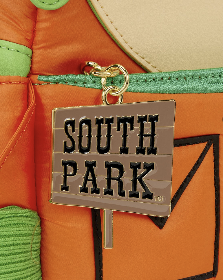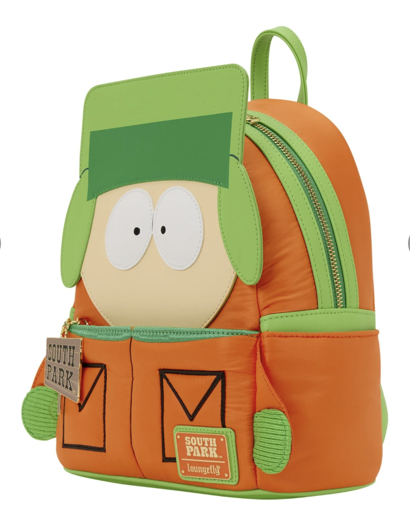 Welcome to South Park! This Kyle mini backpack is full of fan-favorite details, from his bright orange jacket to his green hat and gloves. The character is brought to life with layered applique and embroidered features, while the enamel zipper pull on the front pocket shows off the South Park sign. Inside, you’ll find a custom lining with fun images of Kyle throughout. It’s the perfect collectible for any fan of the show!