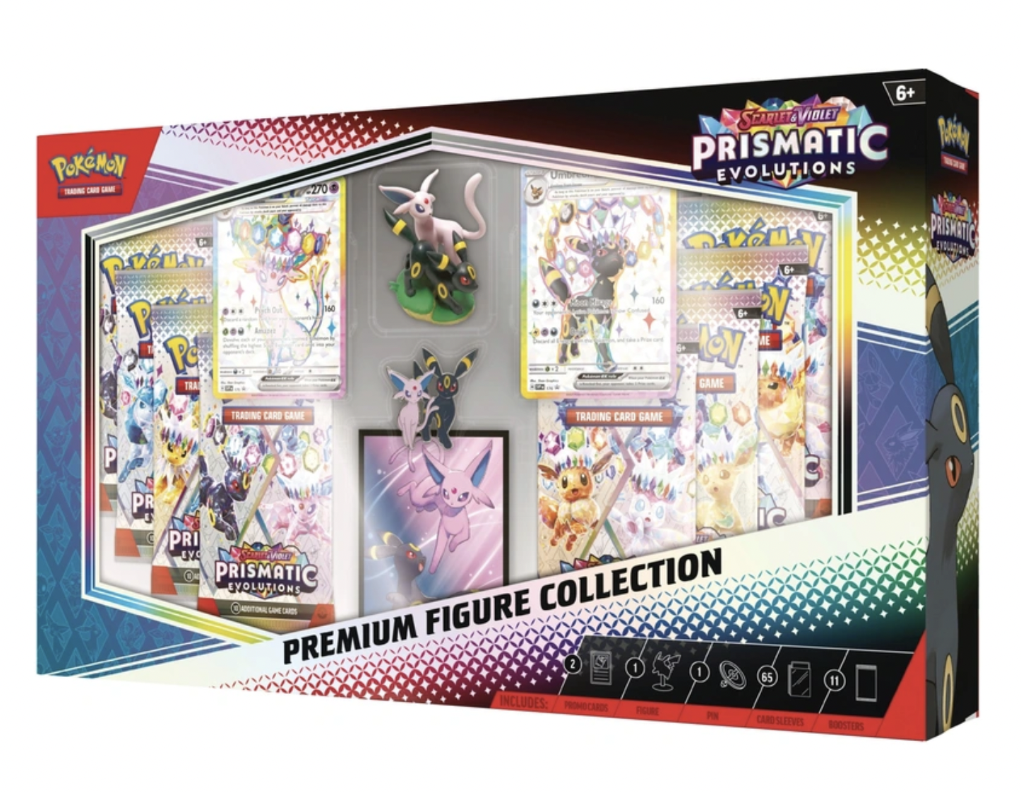 These etched foil promo cards are joined by a display-ready figure showing both of these Eevee Evolutions looking focused and fierce, plus a collectible enamel pin and full set of card sleeves for your next deck. Then, get ready to find even more surprises inside the 11 booster packs from the special Scarlet & Violet: Prismatic Evolutions expansion!