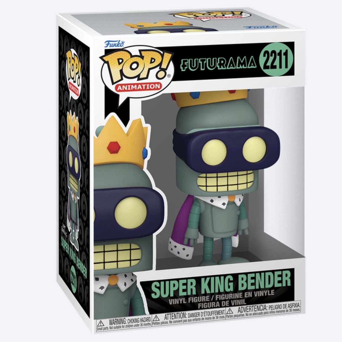Adorned in a crown and cloak, POP! Super King Bender is here to join your POP! Animation collection! Assemble your Planet Express delivery crew by adding this robot to your Futurama lineup today. Vinyl figure is approximately 4.7 in (11.9 cm) tall.